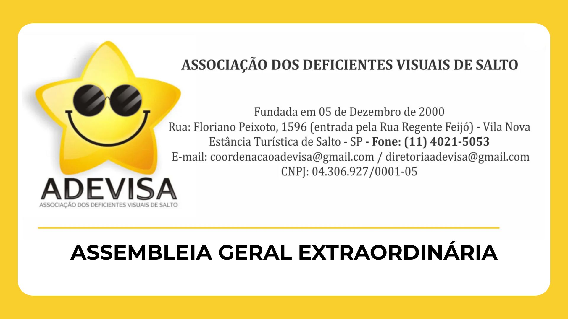 A Associação dos Deficientes Visuais de Salto- ADEVISA devidamente inscrita no CNPJ 04.306.927/0001-05 com sede na Rua Floriano Peixoto, 1596- Vila Nova Salto/SP Por meio da atual Presidente a Sra Roseli, no uso das atribuições que lhe confere, convoca os associados e membros da atual diretoria para reunirem-se em Assembleia Geral Extraordinária a ser realizado no dia 03 de novembro de 2025, às 17:30h em primeira convocação, e às 18h em segunda convocação à Rua Floriano Peixoto, 1596- Vila Nova Salto/SP, na sede da Associação. Para deliberarem a seguinte ordem do dia: