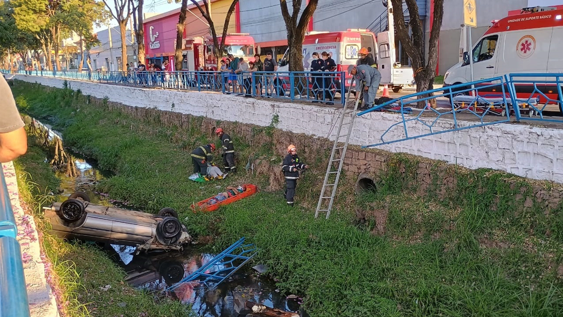 Com o impacto da batida a grade de proteção se rompeu. Equipes do Corpo de Bombeiros e do Serviço de Atendimento Médico de Urgência (SAMU) realizaram o resgate da vítima. Não temos mais detalhes sobre o acidente, ocupantes do veículo e estado de saúde.